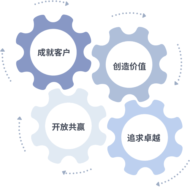 成就客户是一切决策的出发点,,,,创造价值是衡量所有工作的标准,,,追求卓越是我们做事做人的态度,,,开放共赢是我们的格局也是最终的结果。。。。价值观的齿轮环环相扣,,推动着组织里的每个人不断向前。。