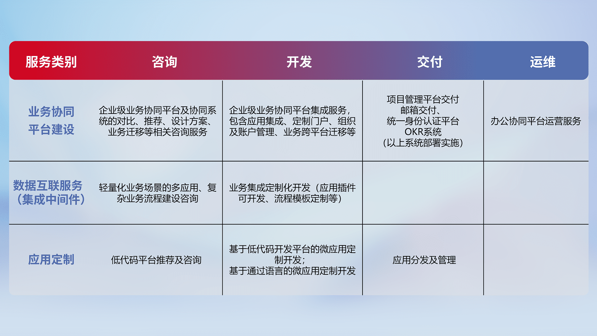针对钉钉、、、企微、、、、IDaas等平台级产品提供产品的规划、、方案、、、、交付、、、、定制化开发等服务,,,,实现如统一协同办公、、、、智能客户服务、、混合会议管理、、、智能数据查询、、、、等业务场景,,,,实现数字化转型。。。