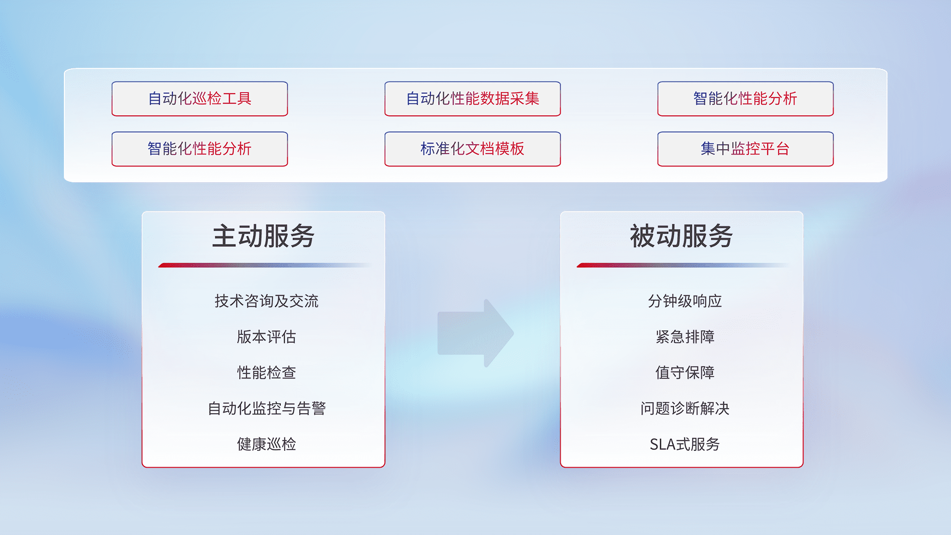 智能化工具和标准化文档,,,,保障服务质量,,提供主动服务(包含技术咨询、、版本评估、、性能检查、、、自动化监控与告警、、、、健康巡检)和被动服务包含(分钟级响应、、、紧急排障、、、值守保障、、问题诊断解决、、SLA服务)。。